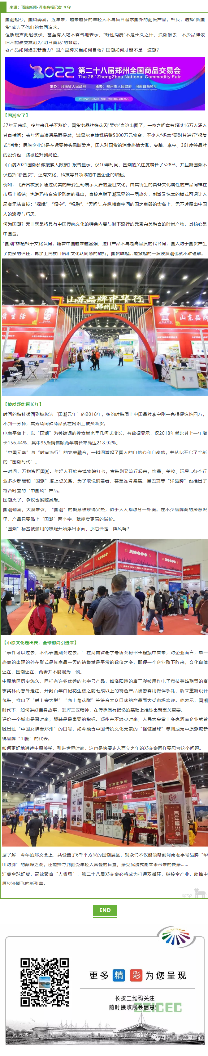 首頁新聞中心展會新聞文章詳情 文章詳情 傳統(tǒng)與潮流碰撞!看鄭交會如何玩轉(zhuǎn)“新國潮” 國潮起兮,國風奔涌。近年來,越來越多的年輕人不再盲目追求國外的潮流產(chǎn)品,相反,選擇“新國貨”成為了他們的共同追求。 但質(zhì)疑聲此起彼伏,甚至有人毫不客氣地表示,“野性消費”不是長久之計,浪潮褪去,不少品牌依舊不能改變其淪為“明日黃花”的命運。 老產(chǎn)品如何煥發(fā)新活力?國產(chǎn)品牌又當如何自救?國潮如何才能不是一波潮?