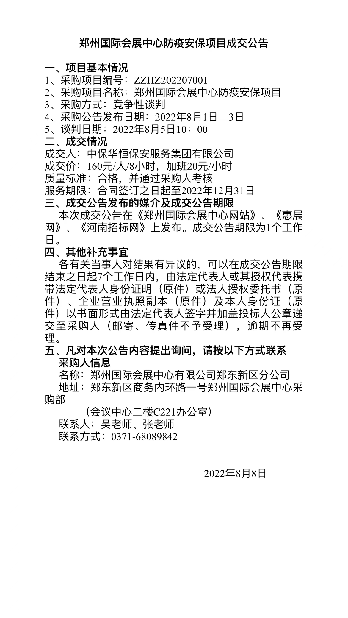 鄭州國際會(huì)展中心防疫安保項(xiàng)目成交公告