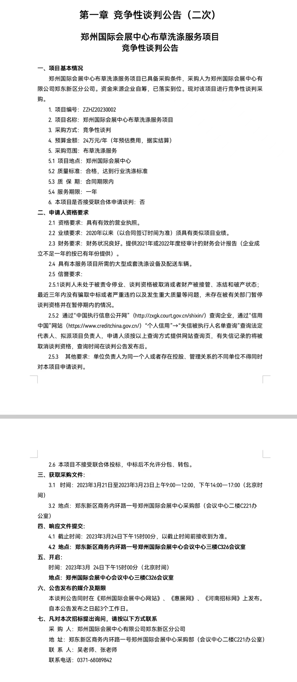 鄭州國際會展中心布草洗滌服務(wù)項目 競爭性談判公告(二次)