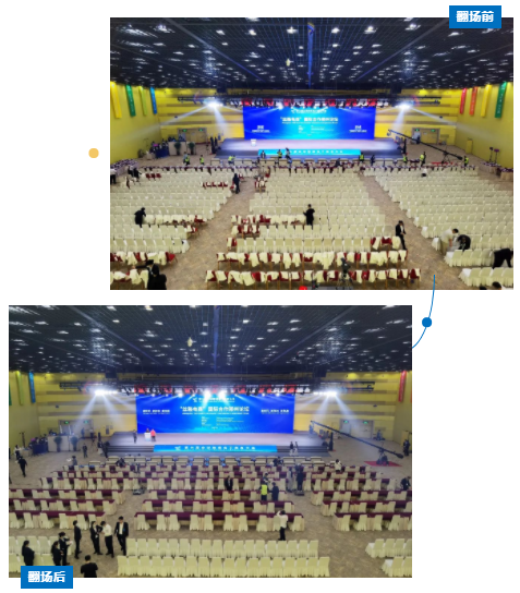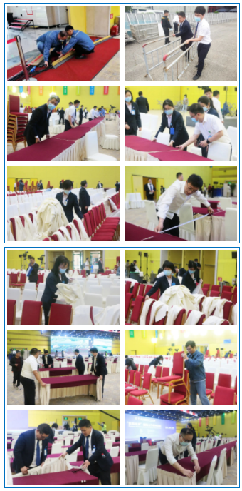 開(kāi)幕式暨主論壇結(jié)束后,按照議程安排和主辦方要求,需要在主、分論壇間歇期將2000平方米會(huì)議室由劇院式改為課桌式,桌椅的位置和數(shù)量都需要重新調(diào)整,會(huì)展中心員工充分發(fā)揚(yáng)“敢打硬仗、能打勝仗”的優(yōu)良作風(fēng),全員上下各司其職、分工負(fù)責(zé),現(xiàn)場(chǎng)集結(jié)“桌椅搬運(yùn)組”、“臺(tái)裙臺(tái)呢布置組”、“測(cè)量定位組”并將工作任務(wù)合理分配。拉線測(cè)量、重新定位、調(diào)整間距、桌椅擺放...各小組在統(tǒng)一指揮下50分鐘完成了翻場(chǎng)工作,再次展現(xiàn)出會(huì)展中心高質(zhì)高效的服務(wù)水平。