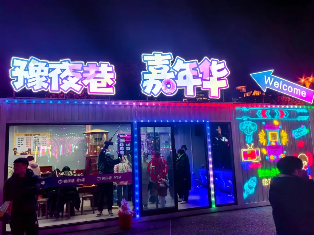 夜幕低垂,華燈初上。豫夜巷整篇街區(qū)都被節(jié)日的氛圍點亮。各商戶門前霓虹閃爍,彩燈交織,夾雜著游客們自帶的氣球、新年配飾,營造出一種夢幻而又溫馨的氛圍。在街區(qū)內(nèi),各商戶早已做好準(zhǔn)備,各式各樣的促銷活動、特色小吃、游玩設(shè)施琳瑯滿目,吸引著各個年齡層的游客駐足流連。