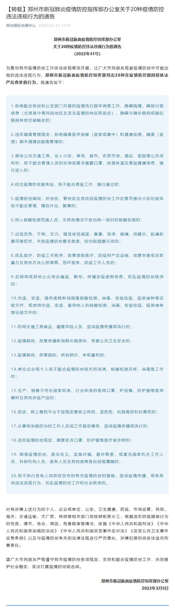 【轉(zhuǎn)載】鄭州市新冠肺炎疫情防控指揮部辦公室關(guān)于20種疫情防控違法違規(guī)行為的通告